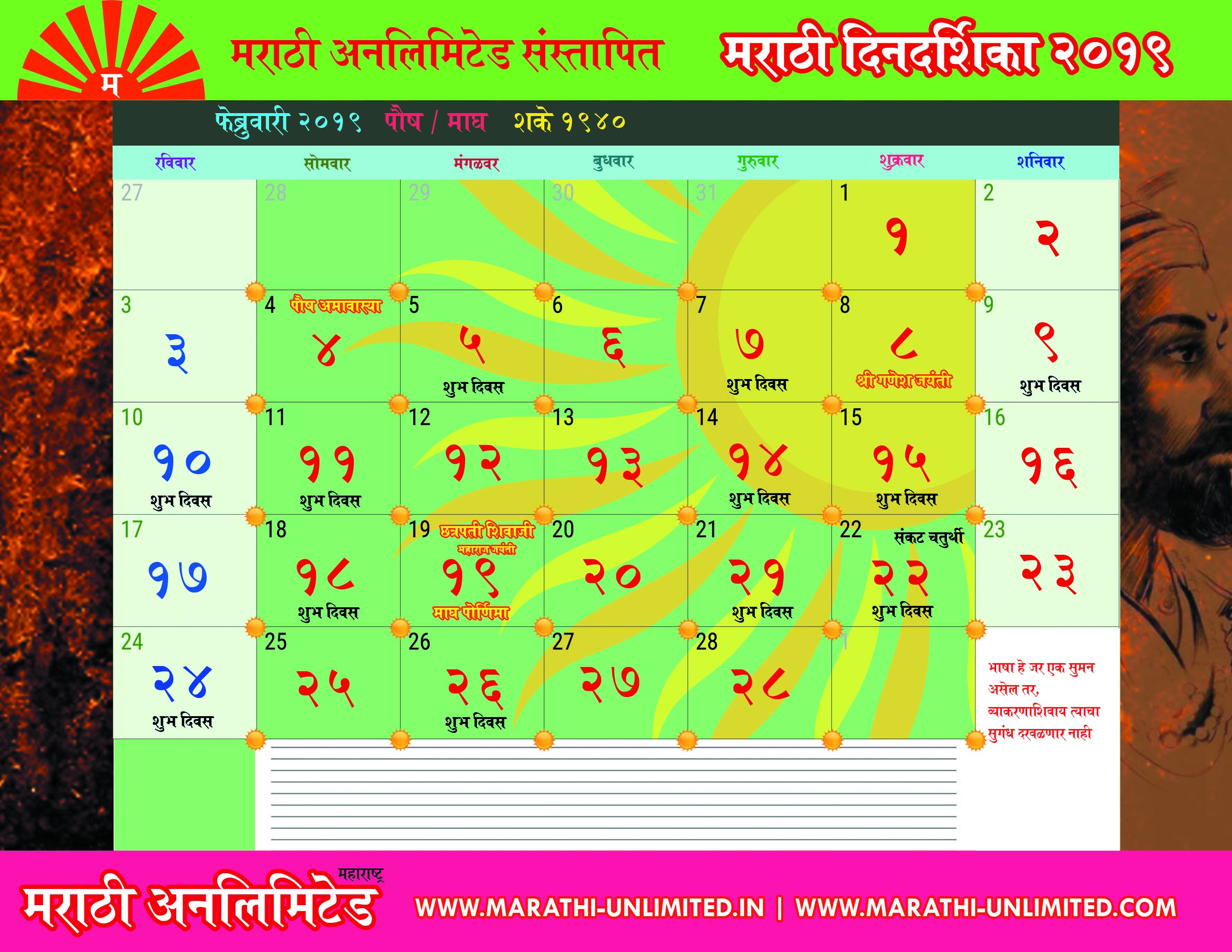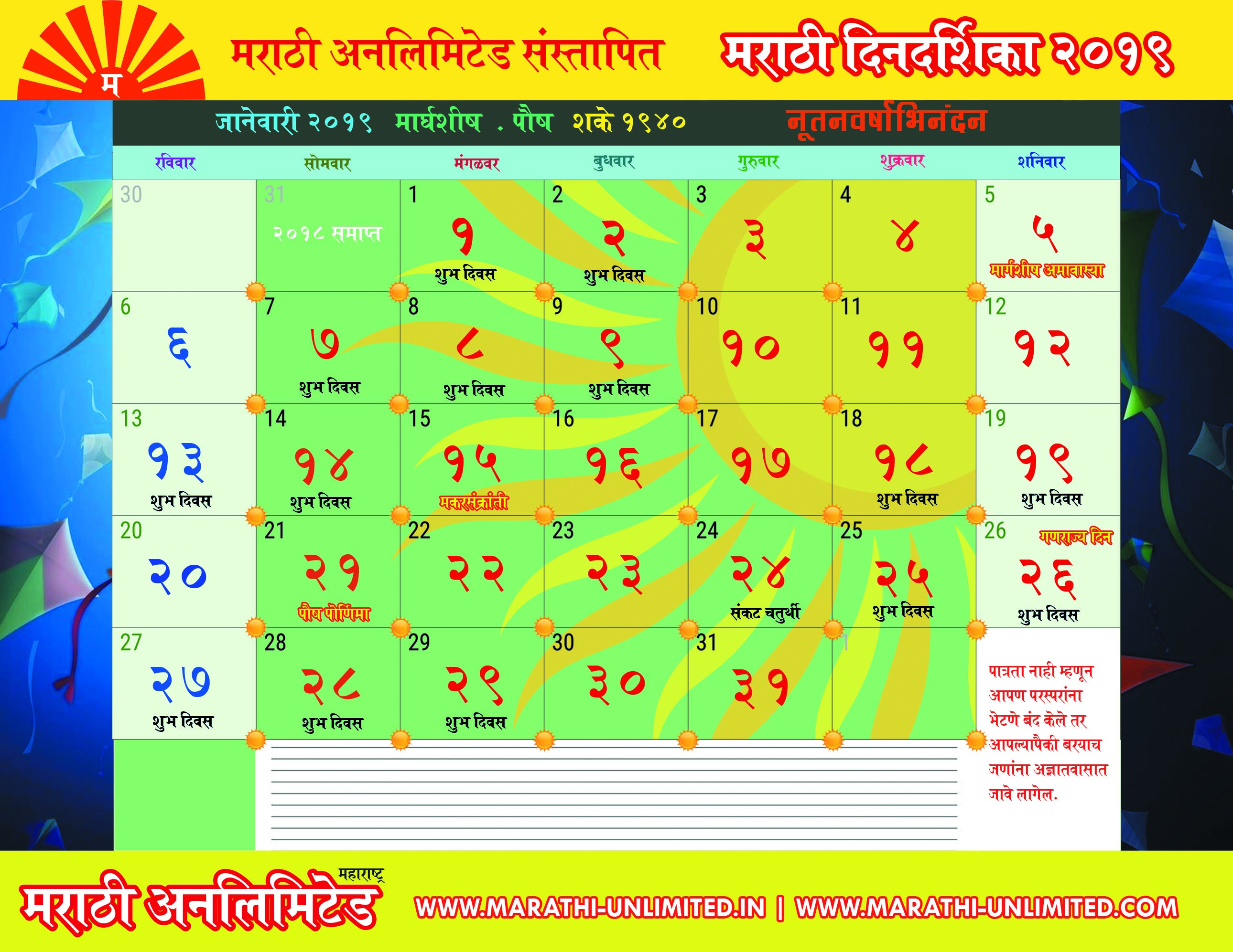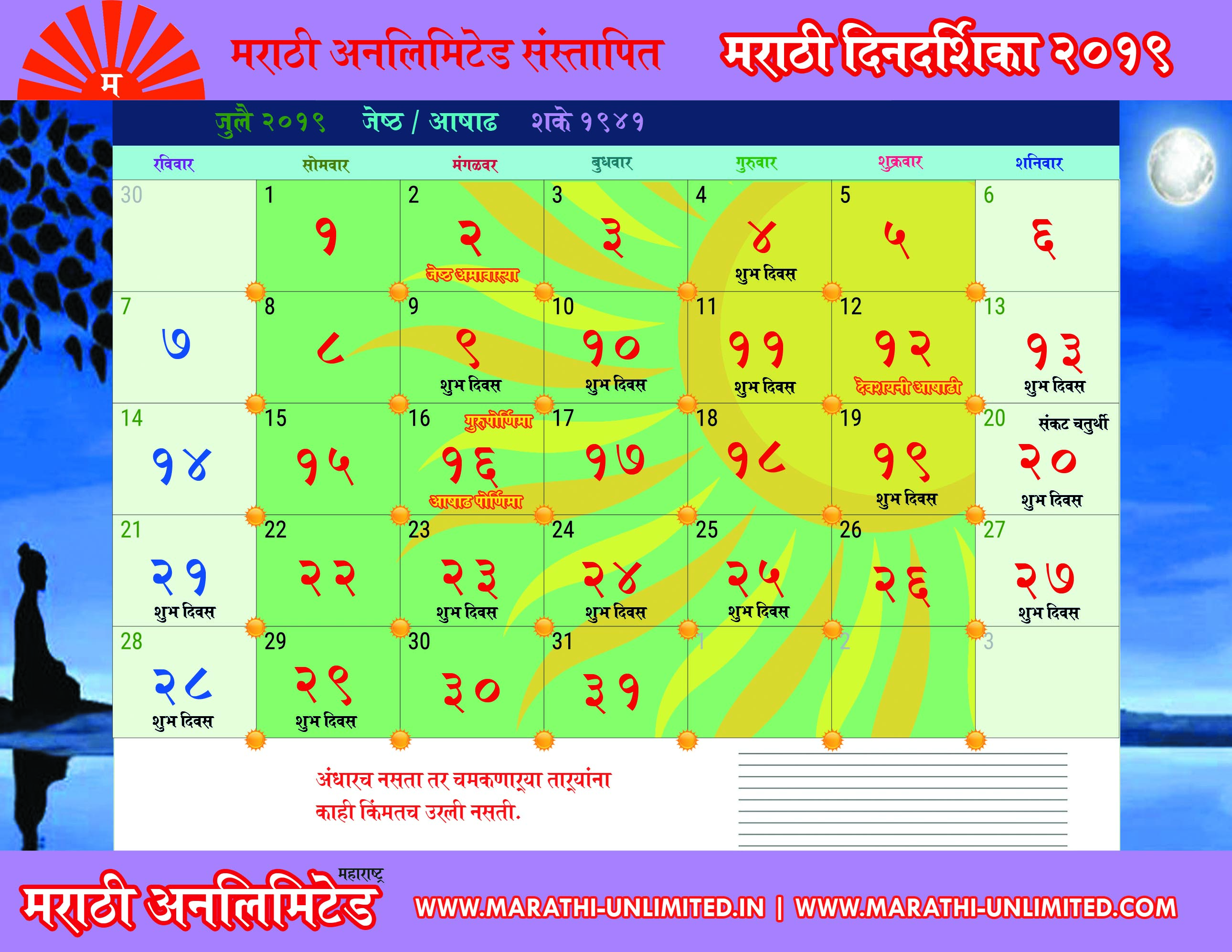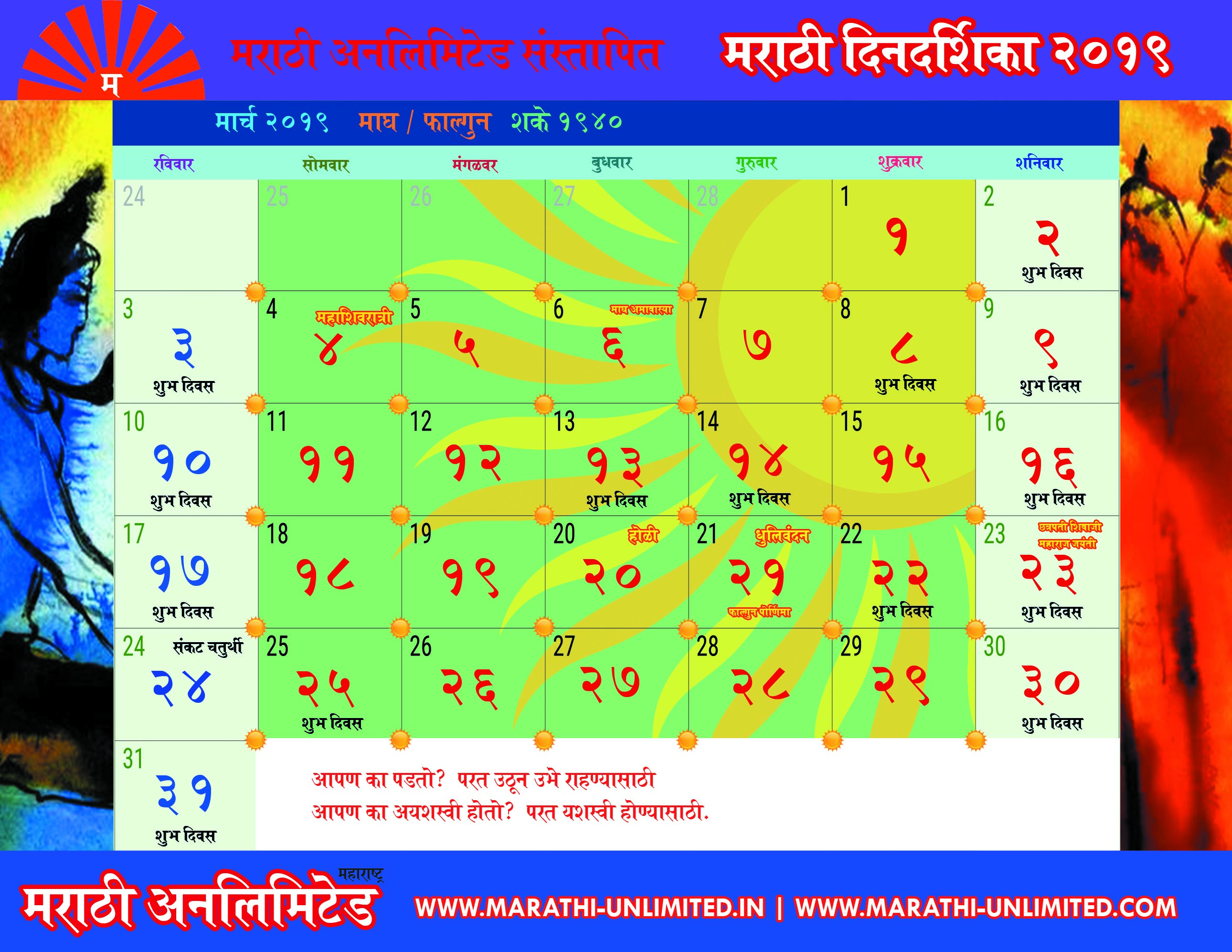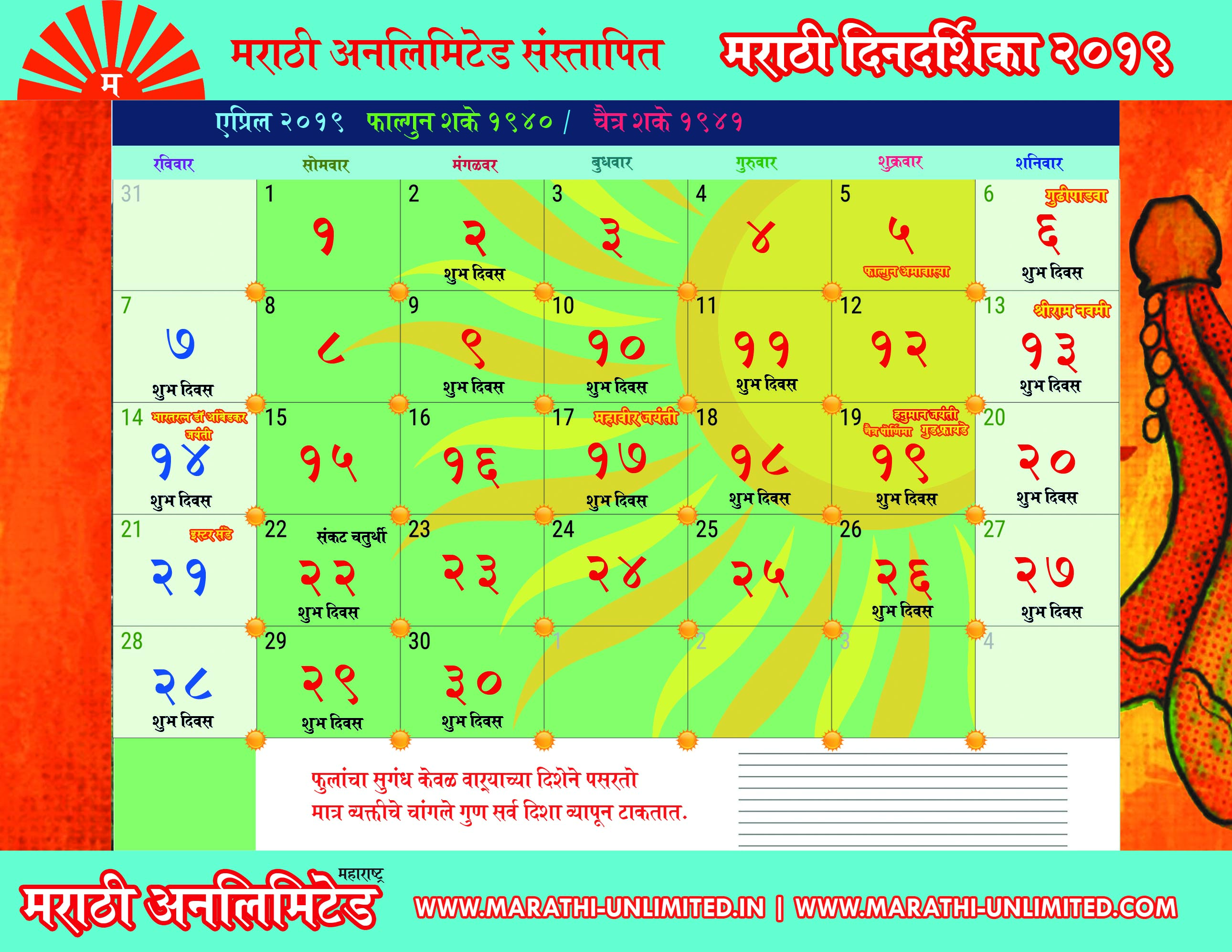Marathi Calendar 2019 Olakh Marashtrachi. Marathi Unlimited Creatives launched Marathi calendar for year 2019. This is specially designed calendar for the people who like the carry calendar in computer or mobiles. Its basically E marathi calendar which is easy to keep in mobiles and computer. You can download this Ecalendar for Free. Its include complete information about Year 2019 and available in Pdf and Android Versions.
