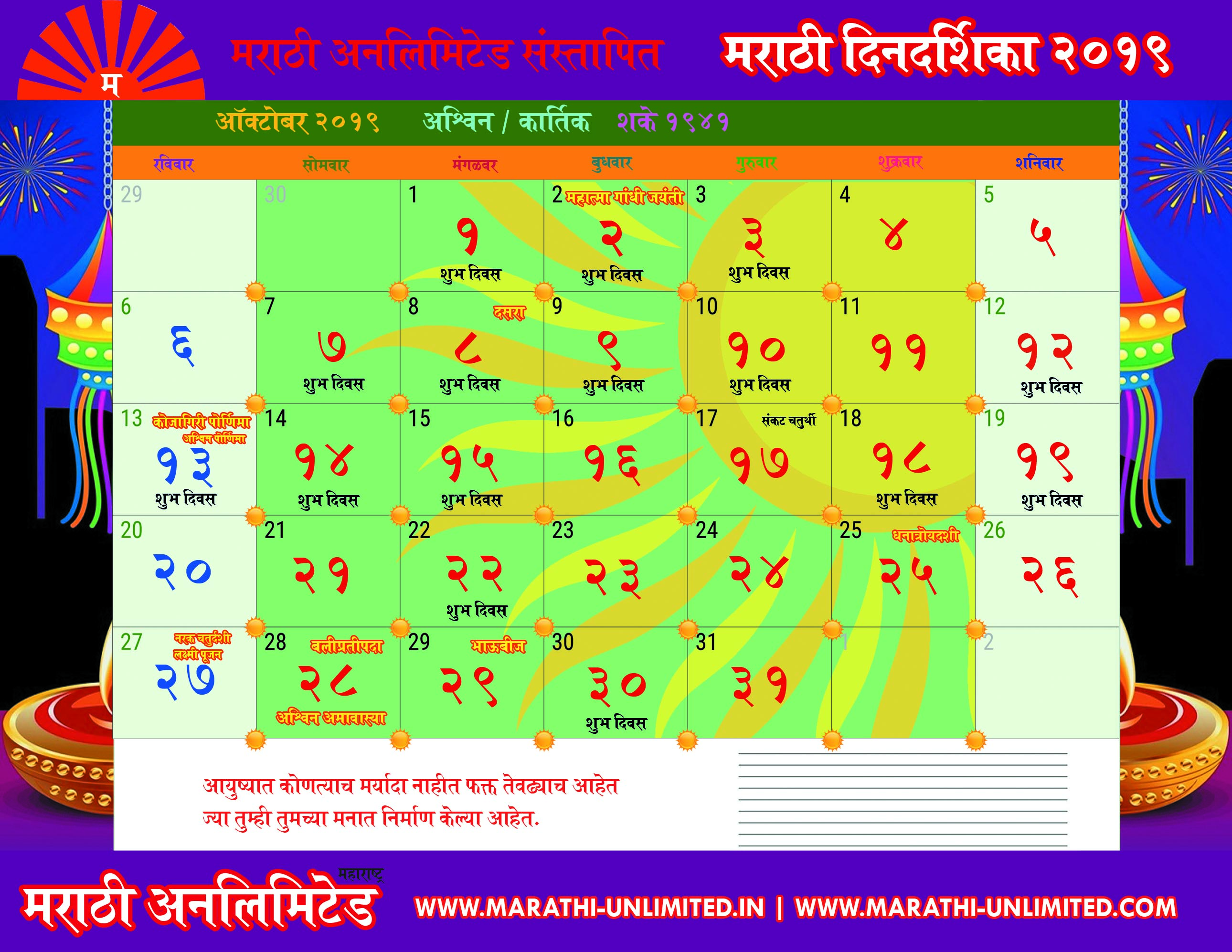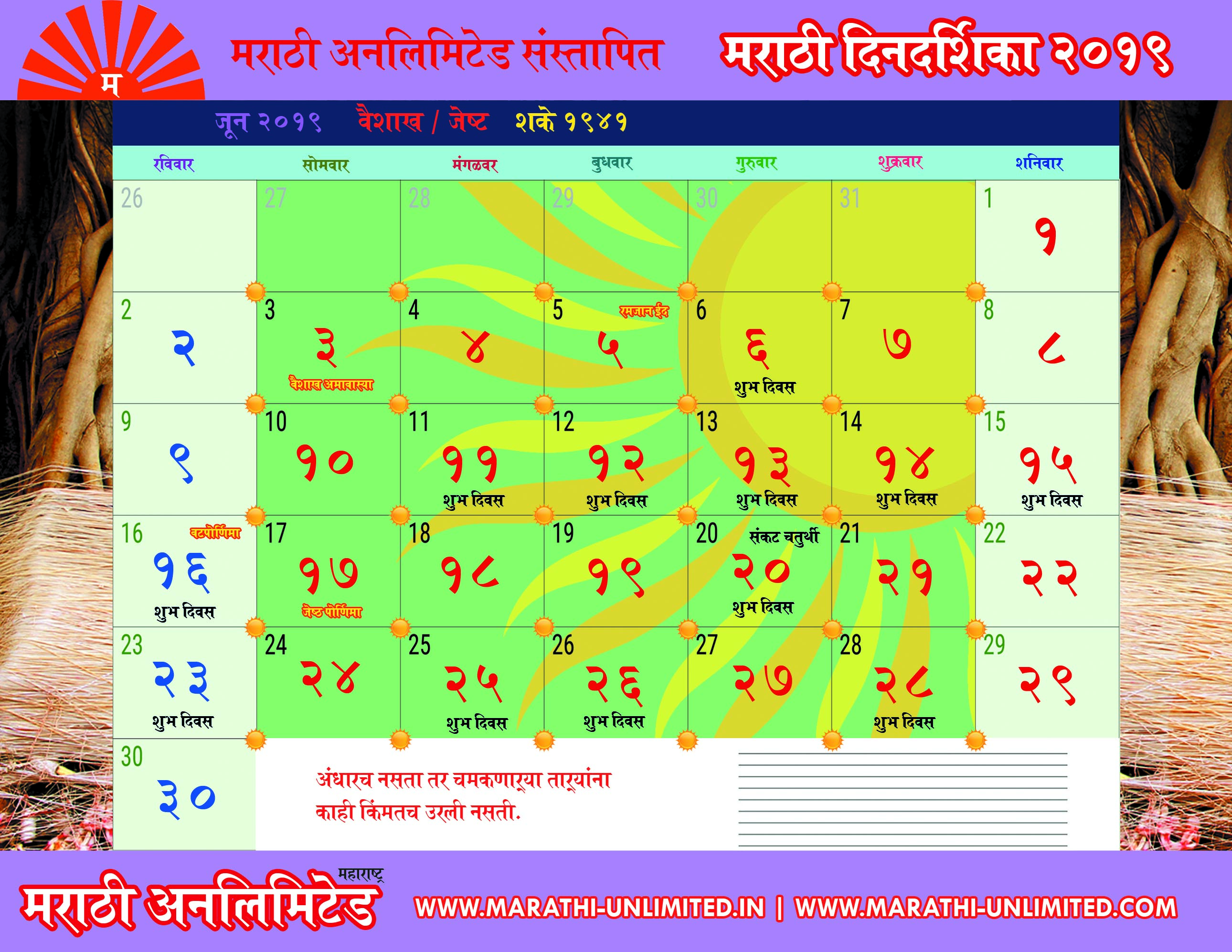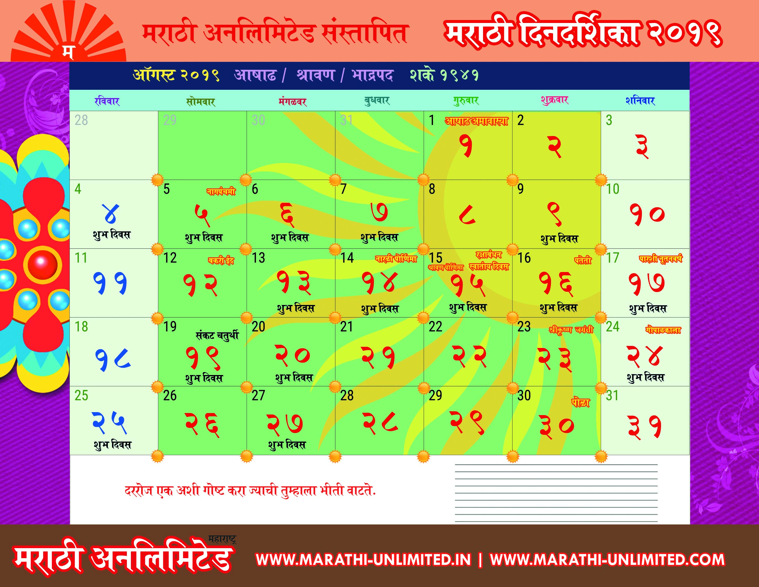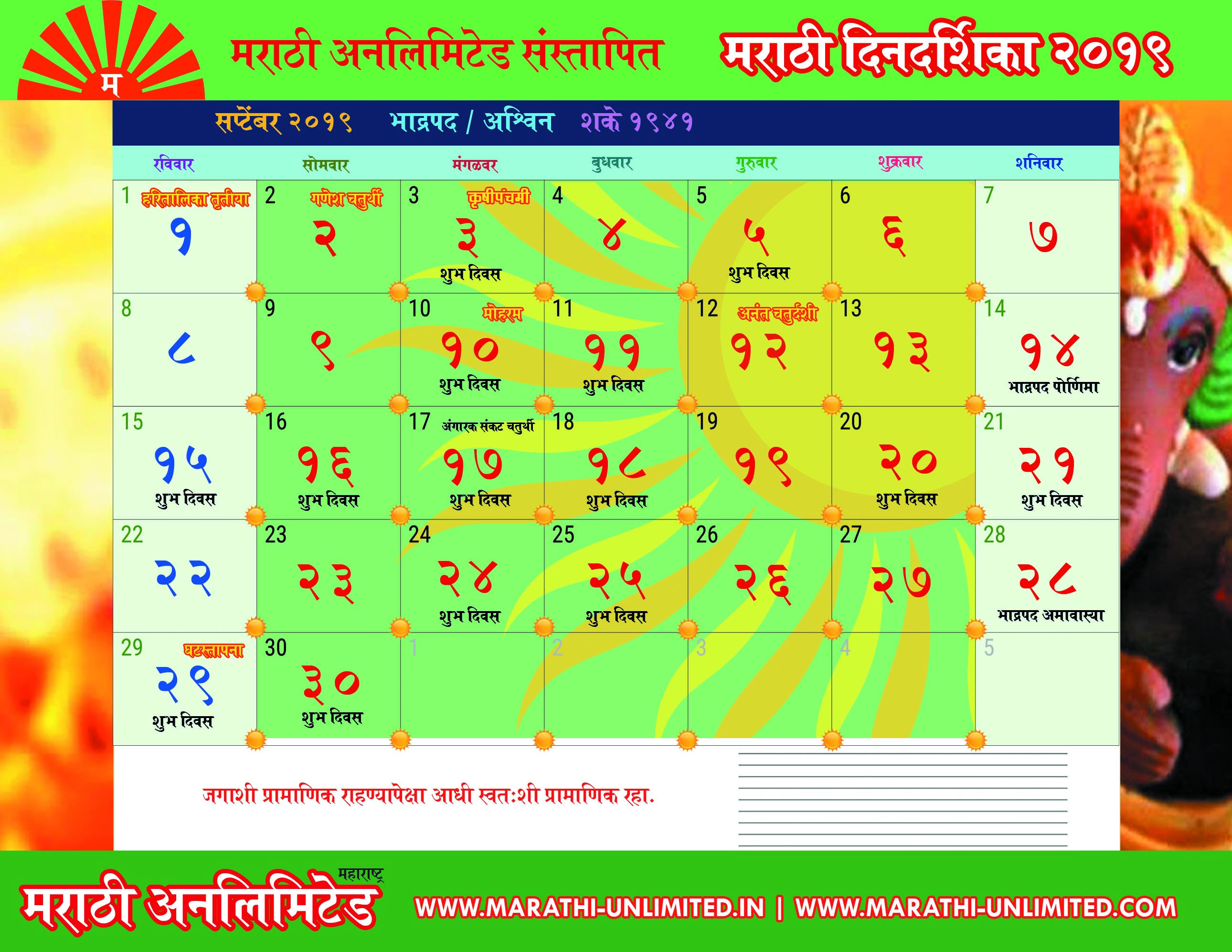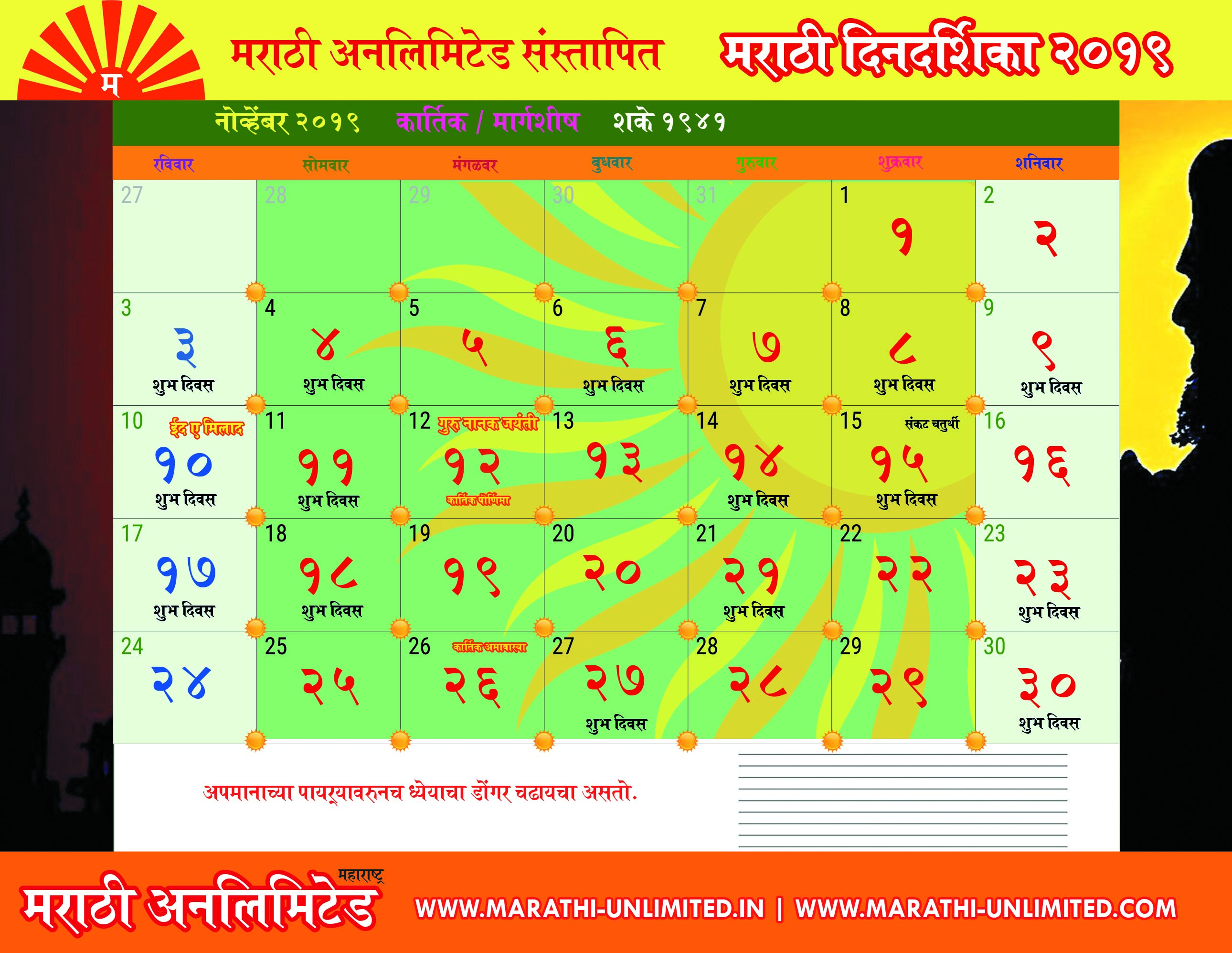 Marathi Calendar 2019 Olakh Marashtrachi. Marathi Unlimited Creatives launched Marathi calendar for year 2019. This is specially designed calendar for the people who like the carry calendar in computer or mobiles. Its basically E marathi calendar which is easy to keep in mobiles and computer. You can download this Ecalendar for Free. Its include complete information about Year 2019 and available in Pdf and Android Versions.